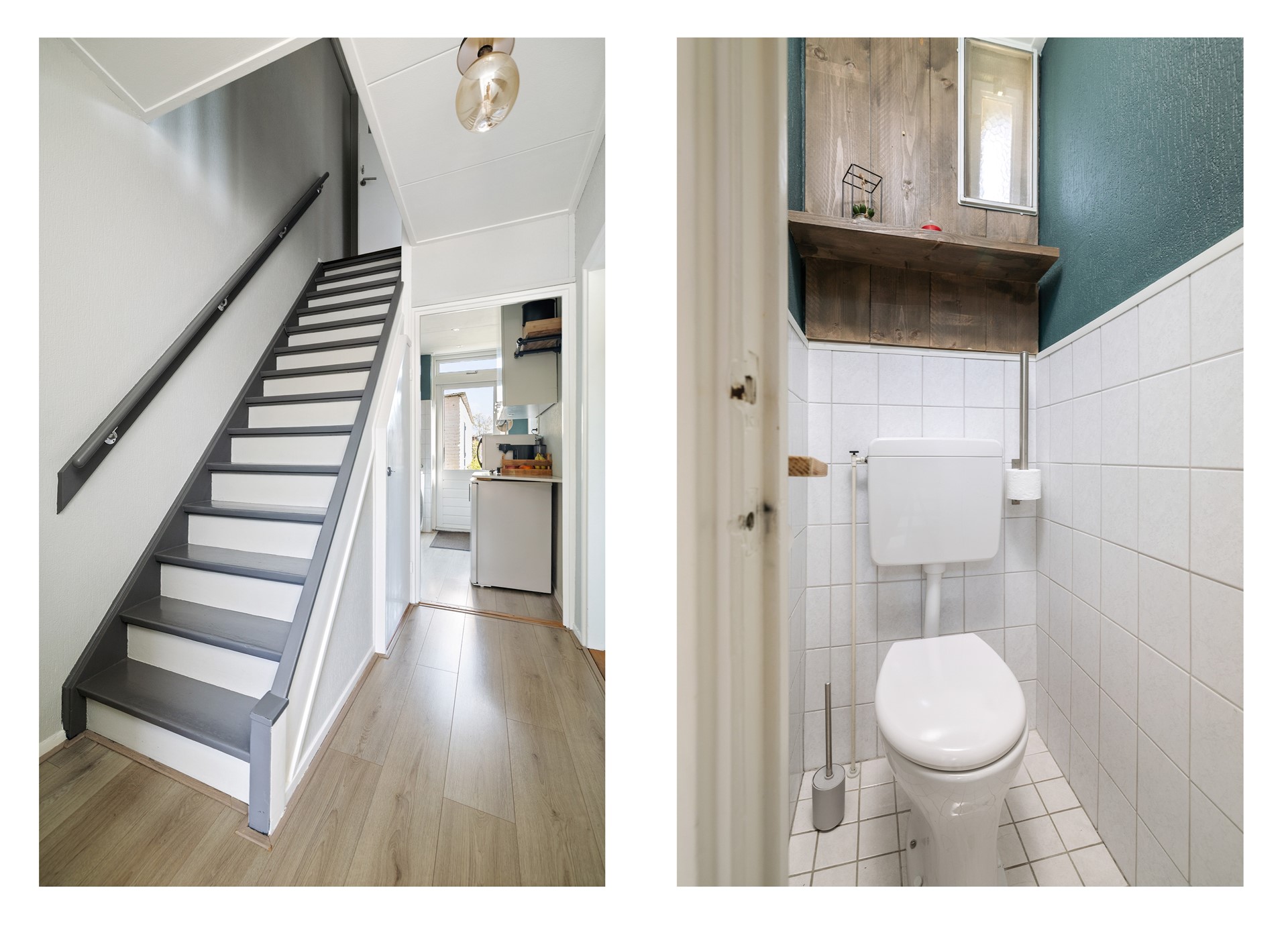 Je betreedt de woning via de hal, waar zich het toilet, de meterkast, een praktische trapkast en de trapopgang naar de eerste verdieping bevinden.