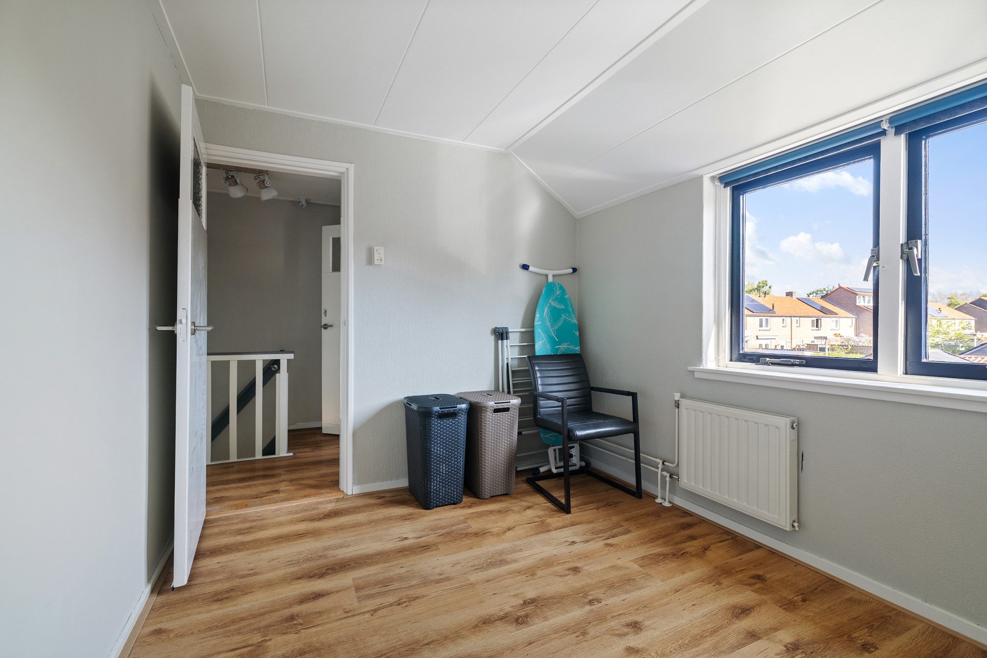 De overloop geeft toegang tot drie slaapkamers. Twee slaapkamers zijn gelegen aan de voorkant van de woning, en één aan de achterkant. De kamers aan de voorkant hebben beide een inloopkast voor extra opbergruimte.