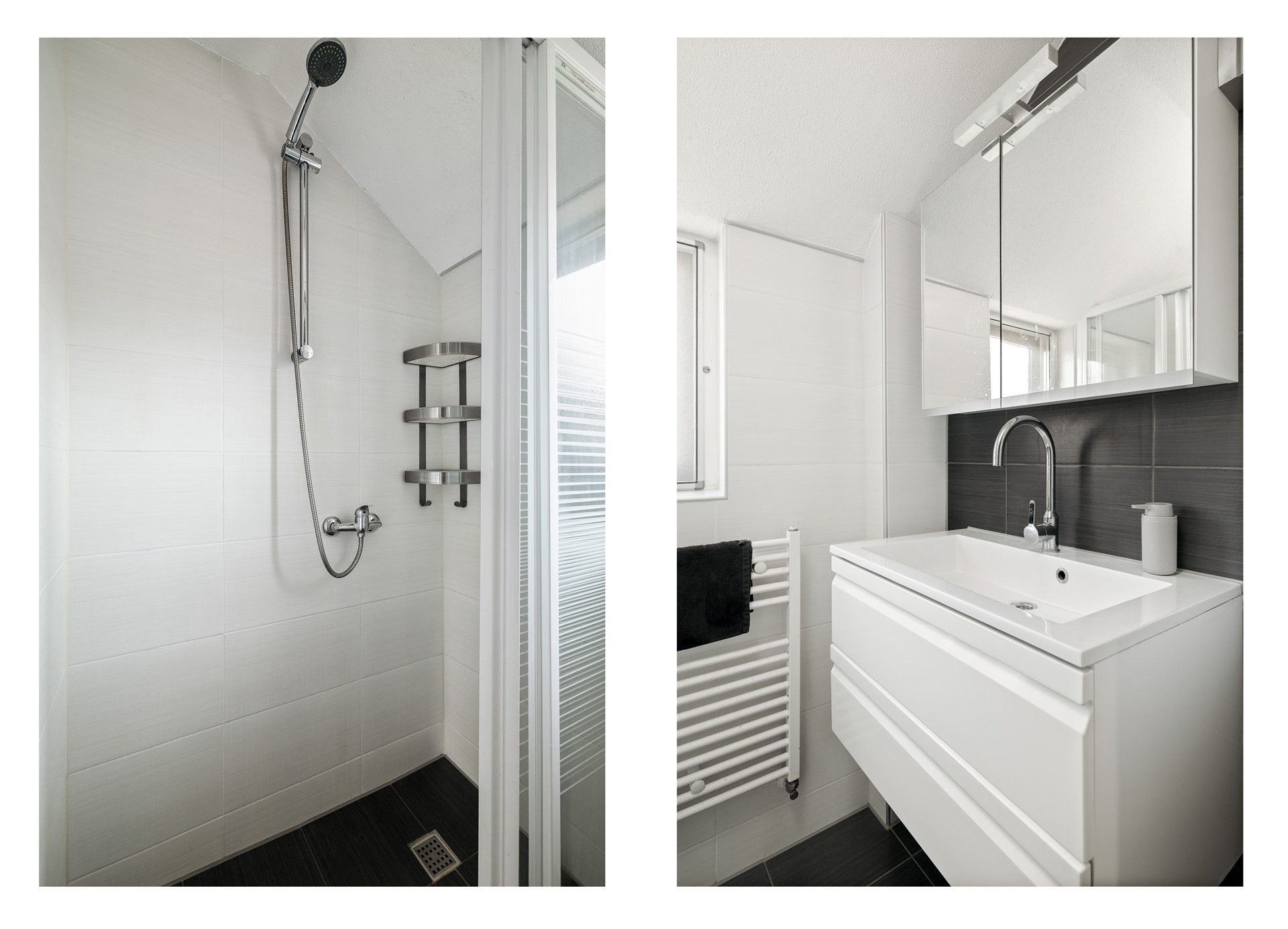 Vanaf de overloop heb je ook toegang tot de badkamer, die is voorzien van een wastafelmeubel en een douche. Verder heeft de eerste verdieping een vlizotrap naar de bergzolder. Hier bevindt zich de opstelplaats van de cv-ketel (Vaillant, 2005) en is extra bergruimte aanwezig.