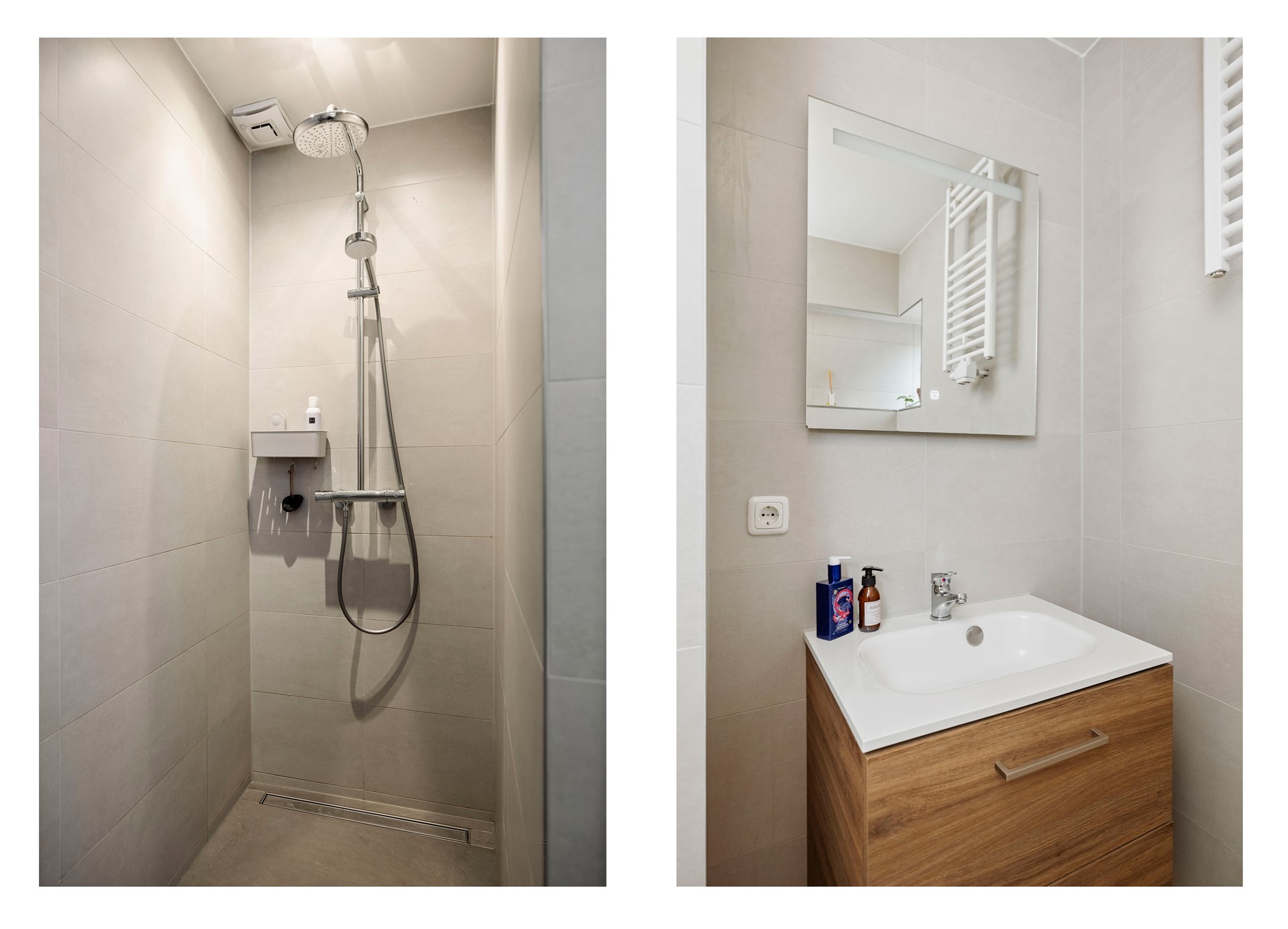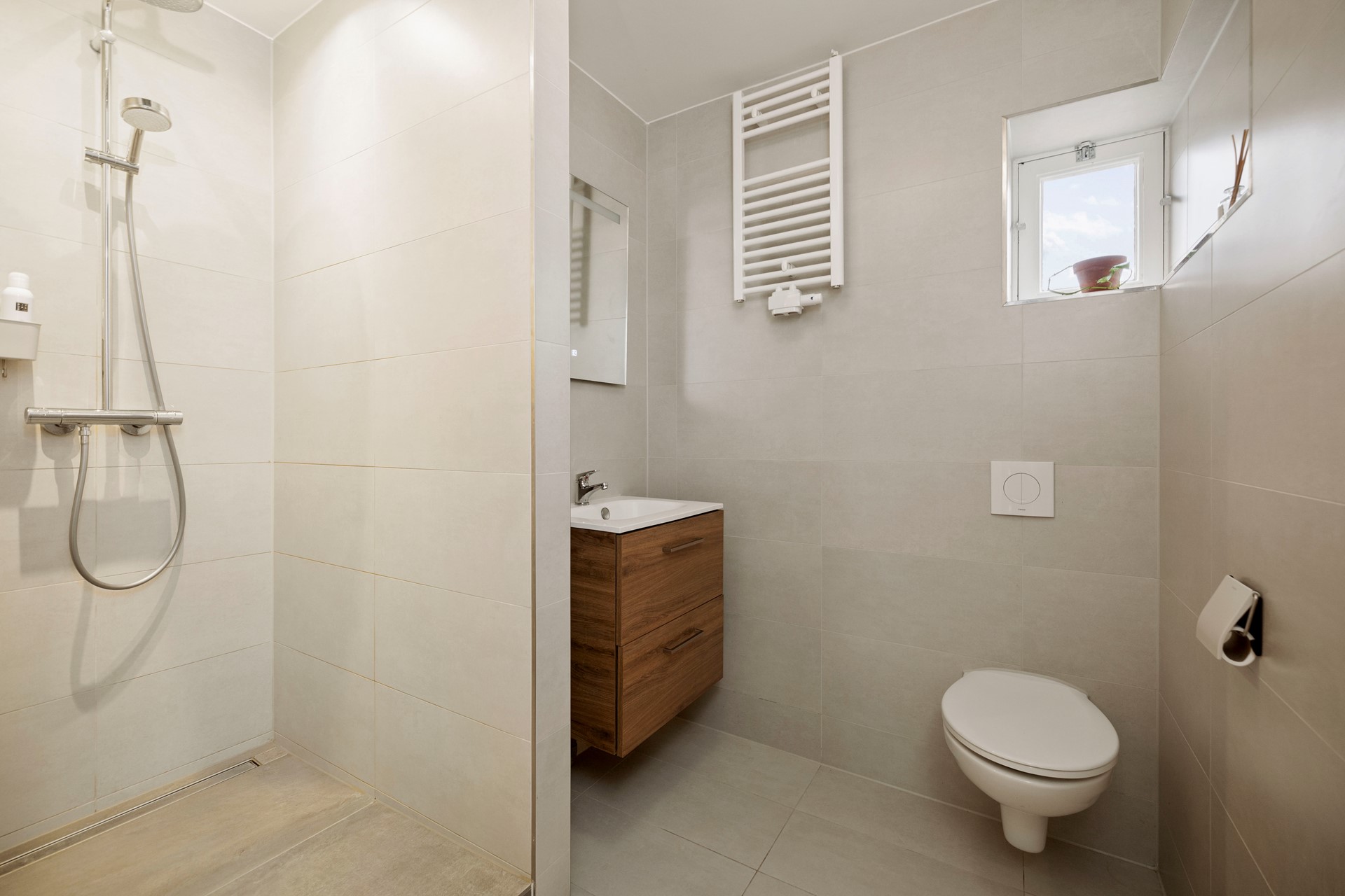 Vanaf de overloop heb je ook toegang tot de badkamer. De moderne badkamer is mooi betegeld en tot in de puntjes afgewerkt. Je vindt er een toilet, wastafelmeubel en een inloop-regendouche.
