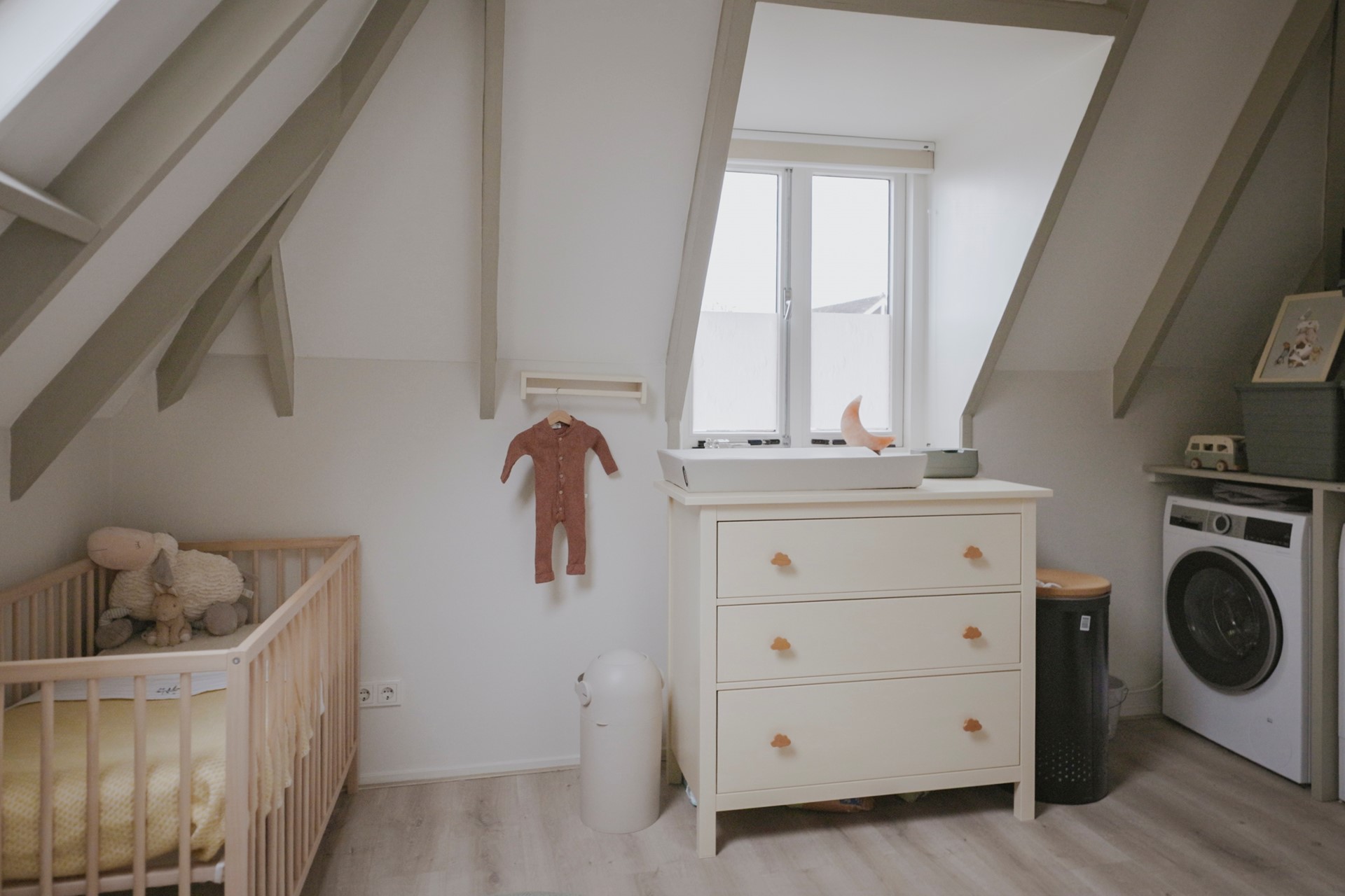Op deze woonlaag is een tweede slaapkamer aanwezig, voorzien van aansluitingen voor wasmachine en droger. Deze ruimte leent zich ook goed als werkplek.
