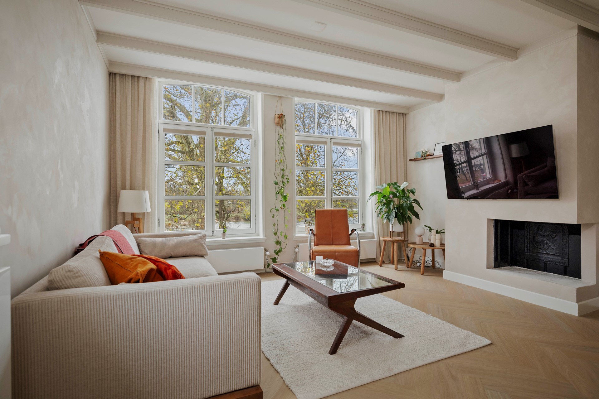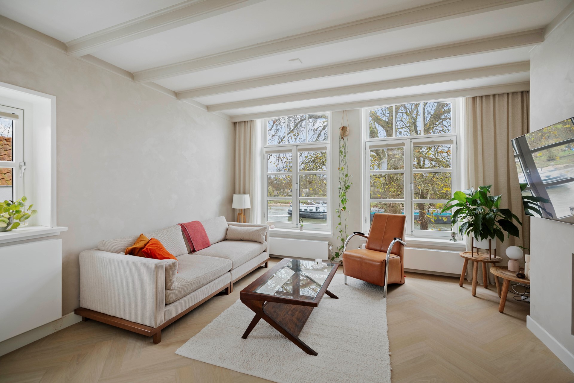 Via de overloop kom je in de mooi afgewerkte woonkamer, waar een open haard voor warmte zorgt op koude dagen. Hoge plafonds en grote raampartijen zorgen voor een bijzonder ruimtelijk gevoel en een schitterend uitzicht: de IJssel meandert voor je ogen.