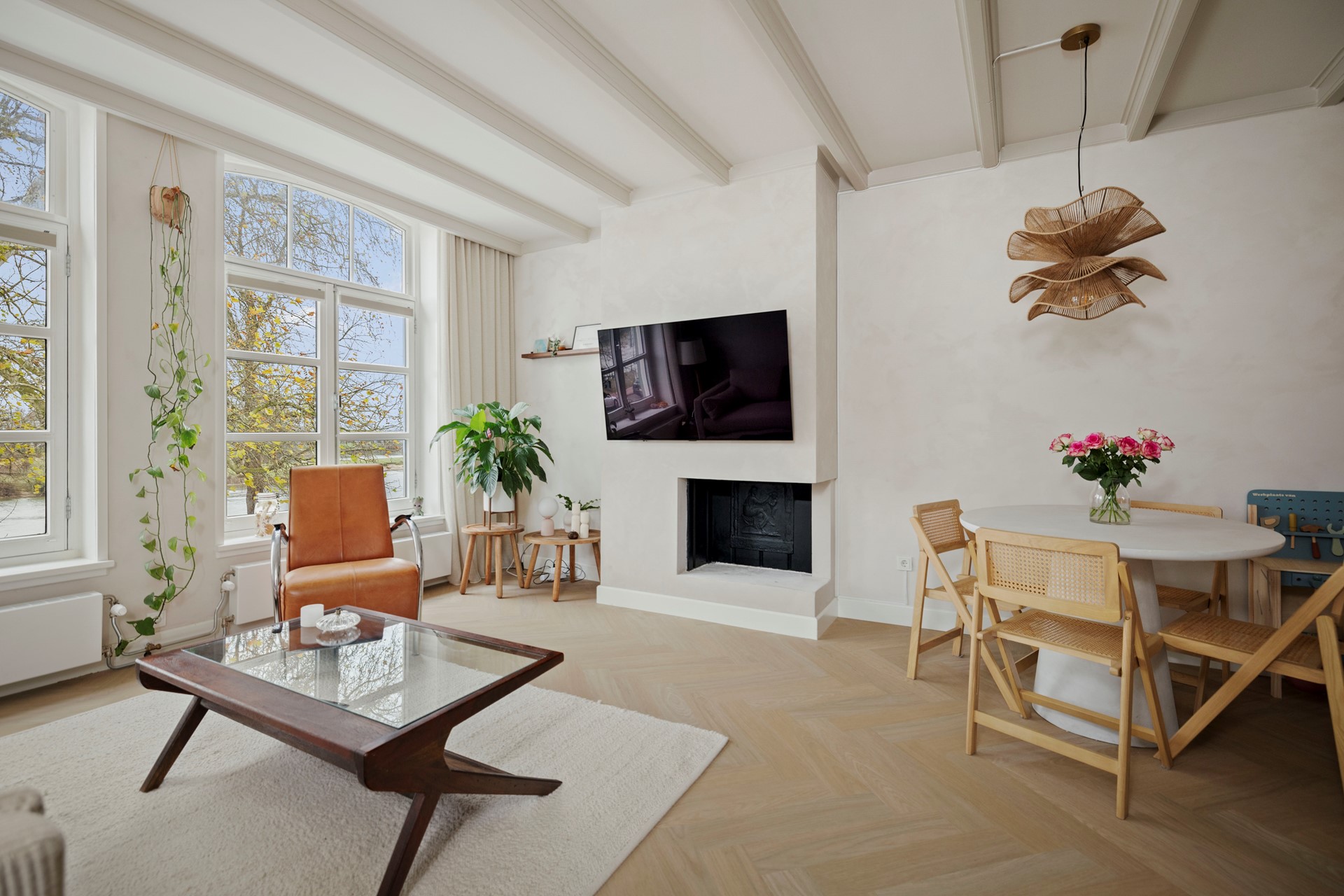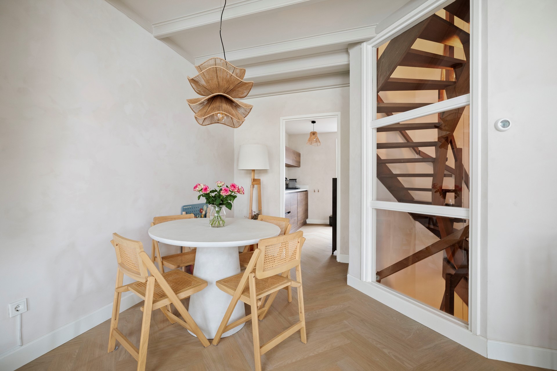 Wat meteen opvalt is het vele licht dat van alle kanten de woning binnenvalt. Dat is niet alleen te danken aan de hoge raampartijen, maar ook aan het glas tussen de woonkamer en het trappenhuis. Een prachtige visgraatvloer (2023) en charmante paneeldeuren geven deze woonlaag een uniek karakter.