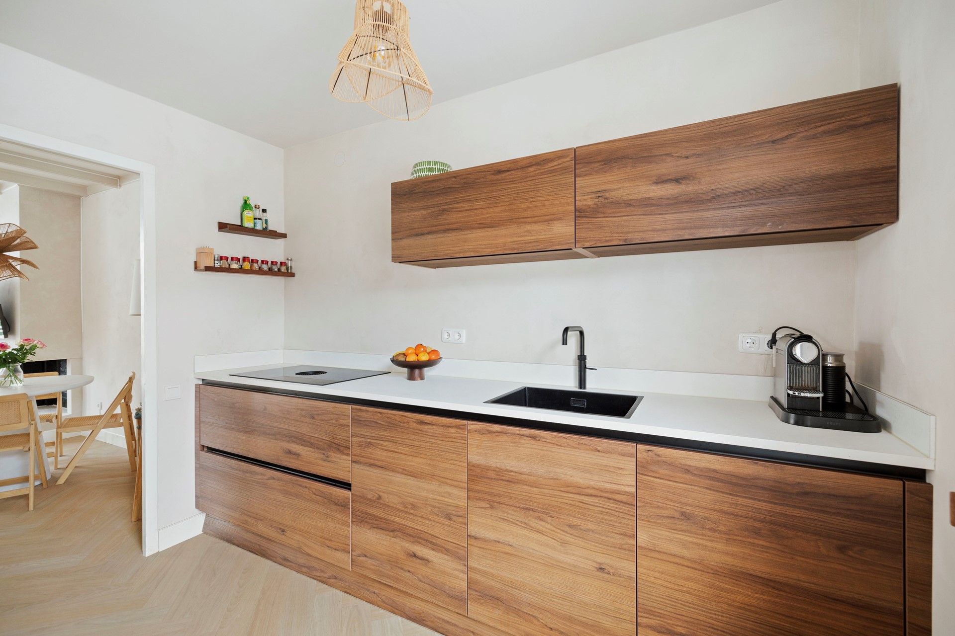 In de woonkamer vind je een eetgedeelte, vanuit waar je de keuken inloopt. De stijlvolle keuken (vernieuwd in 2023) is uitgerust met een inductiekookplaat met downdraft afzuiging, Quooker, vaatwasser, koelkast en combioven. Terwijl je kookt, kijk je uit over de historische binnenstad van Deventer.