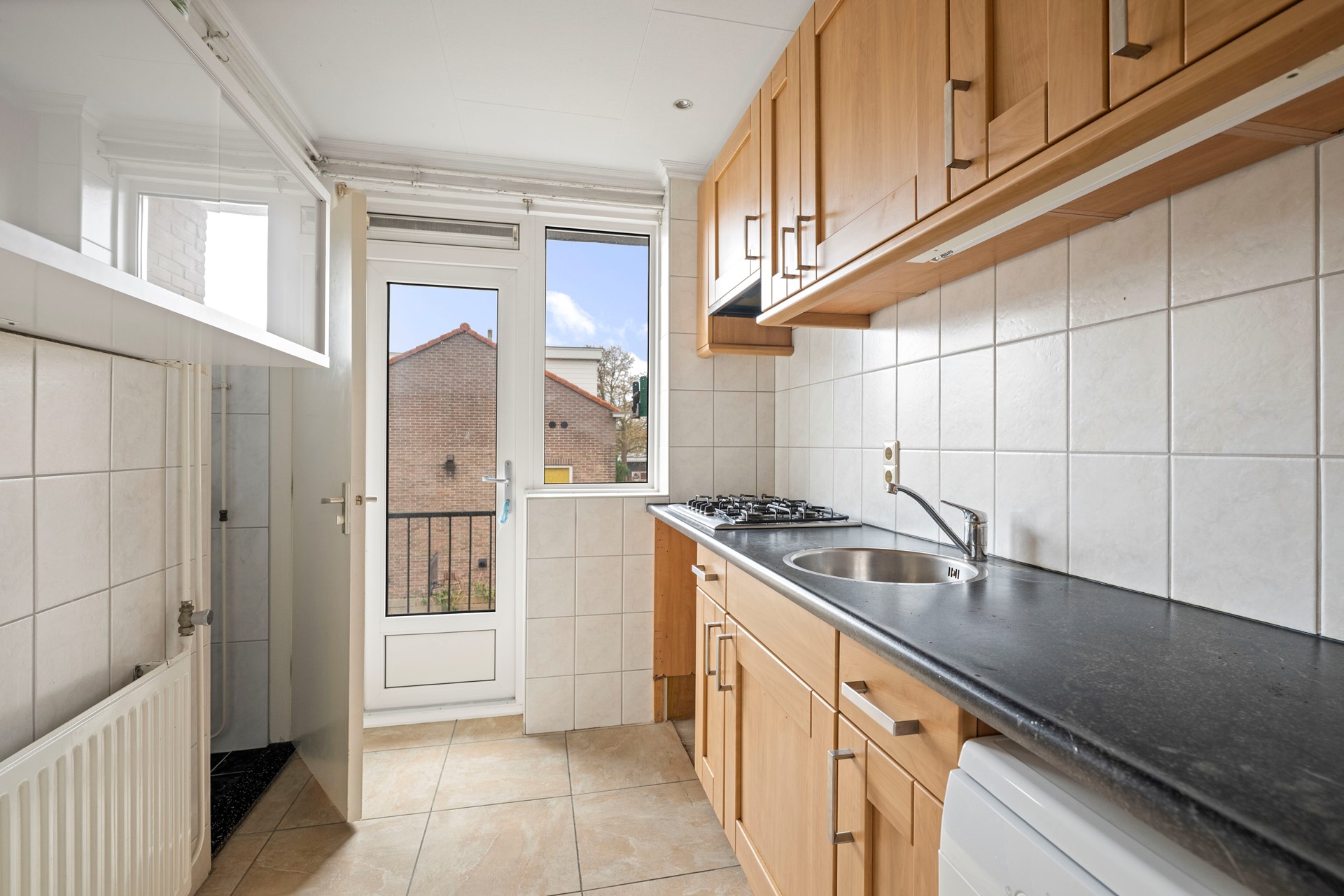 De keuken is uitgerust met een koelkast, combi-oven, vaatwasser, afzuigkap en een vijfpits gasfornuis, ideaal dus voor kookliefhebbers. Vanuit de keuken heb je toegang tot zowel het balkon aan de achterkant, als de badkamer. De badkamer is voorzien van een douche en een wastafelmeubel, en een ruimte met de cv-ketel (Remeha, 2013).