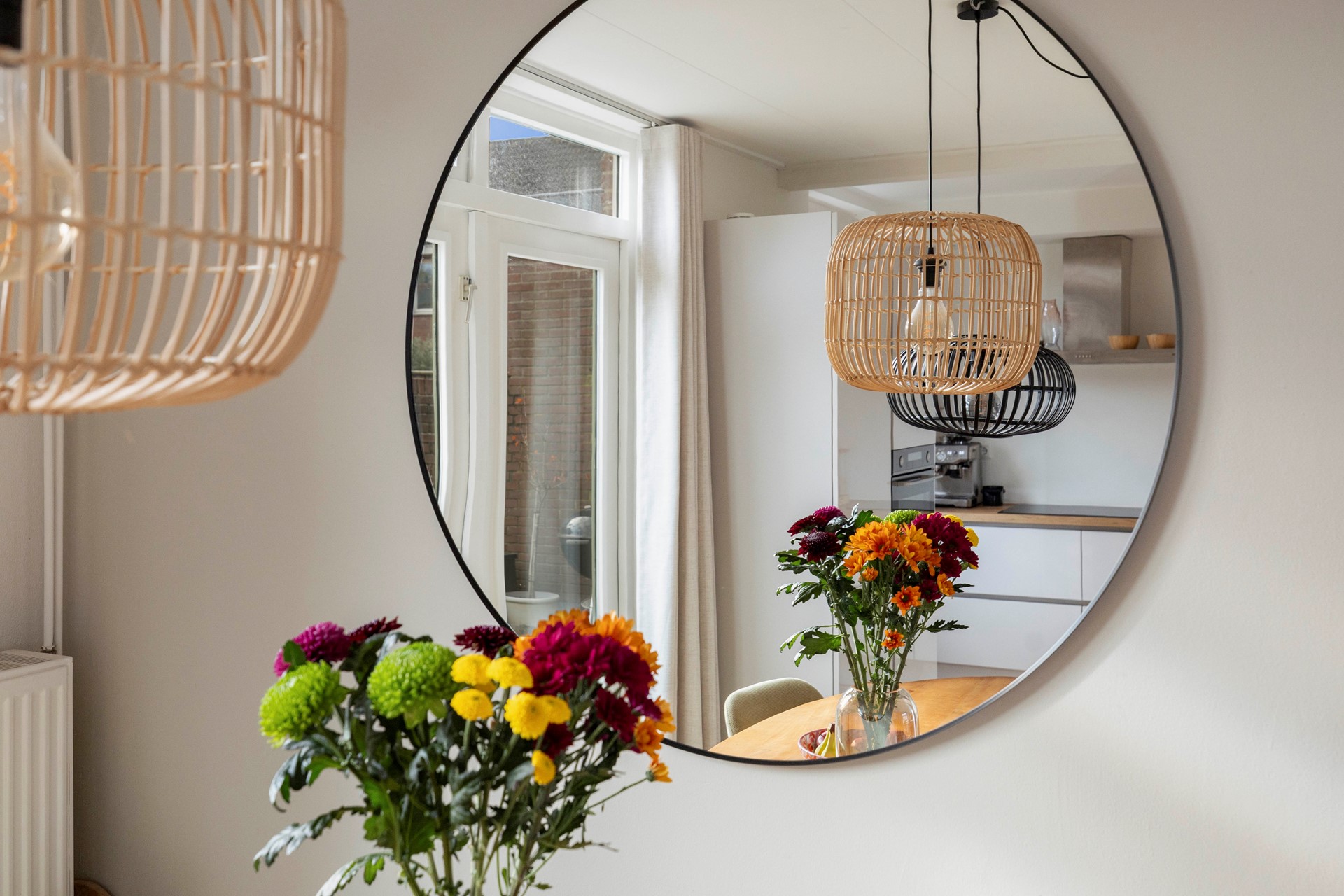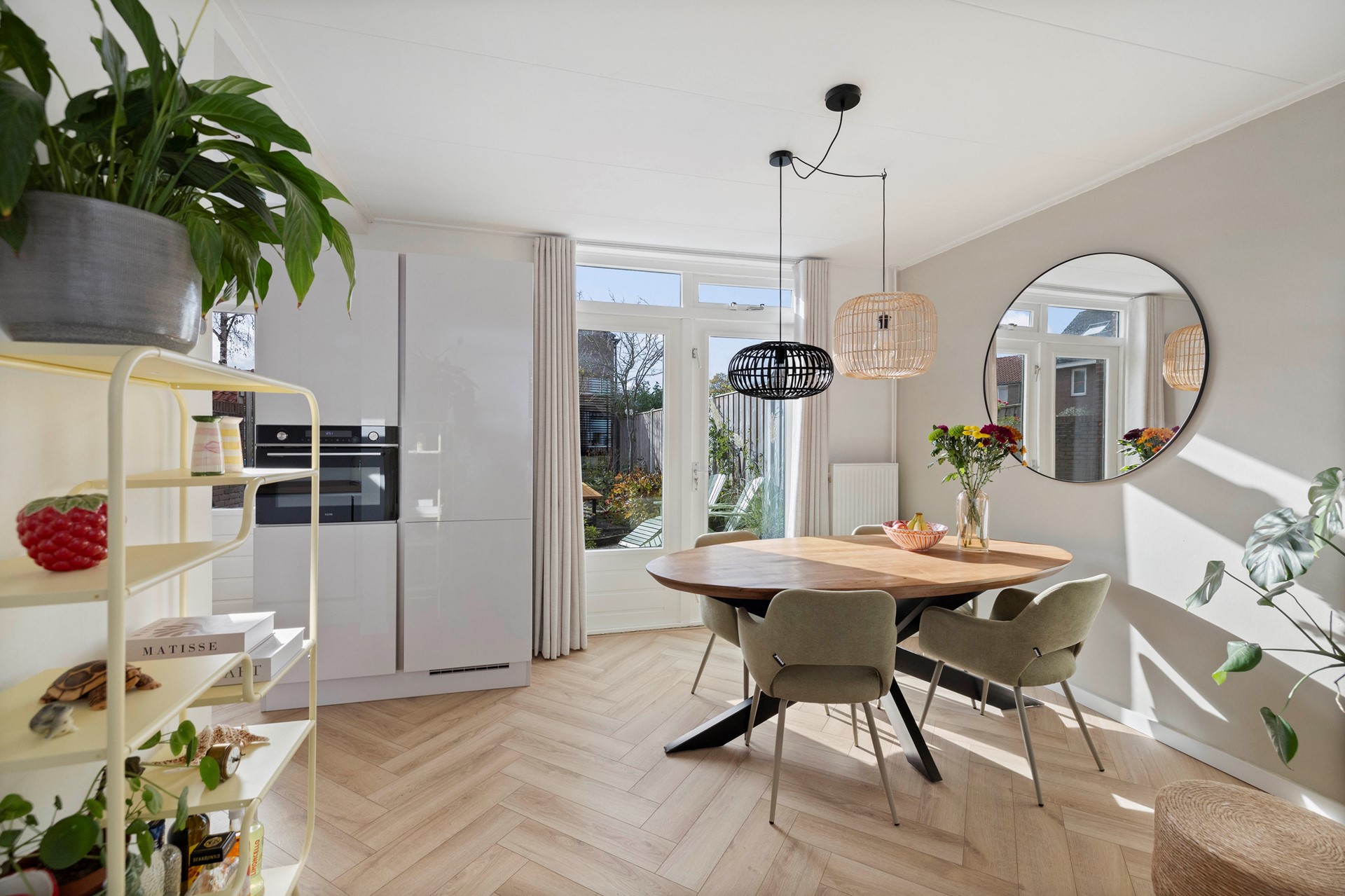 De woonkamer aan de voorkant is heerlijk licht door het grote raam en grenst aan een open keuken. Ook hier valt de verzorgde afwerking van de woning op, waardoor je van deze plek al snel je thuis kunt maken. Dankzij de openslaande deuren betrek je de zonnige tuin eenvoudig bij je woonruimte, ideaal op zomerse dagen. Ook vanuit de keuken stap je zo de tuin in.