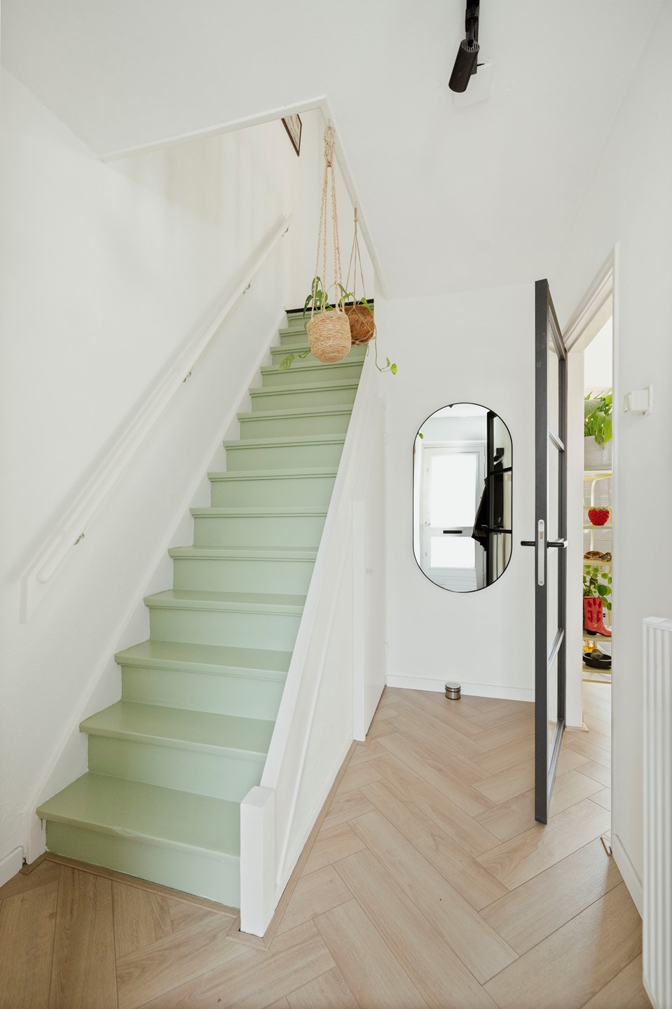 Via de entree kom je binnen in een hal met trap naar boven, een handige kelderkast voor extra opbergruimte, de meterkast en het vernieuwde toilet. De benedenverdieping is geheel voorzien van een sfeervolle laminaatvloer in visgraatmotief.