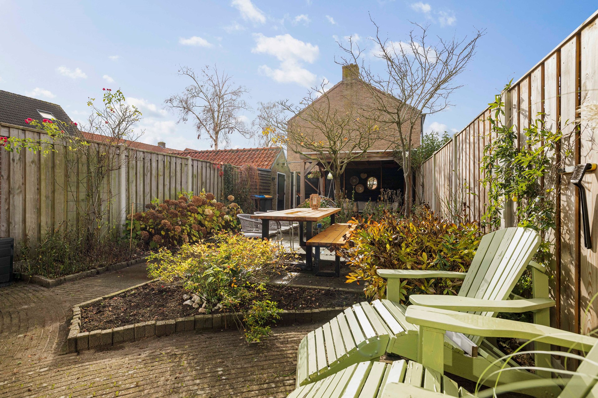 Achter in de tuin staat een stenen schuur om gereedschap en tuinspullen op te bergen, of om je fietsen te stallen. Ook beschik je over een handige achterom.