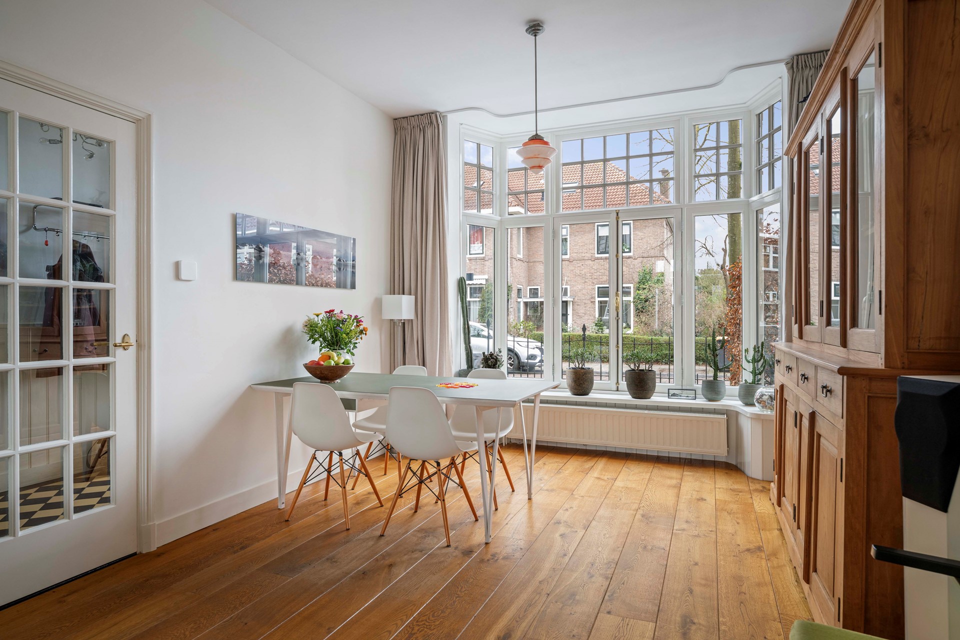 De lichte woonkamer, met erker aan de voorkant en elegante en-suitedeuren richting de serre, is een heerlijke plek om te zijn. Verder zorgt de houten vloer voor een warme sfeer, en dat geldt ook voor de gashaard die je op koude dagen kunt ontsteken. Ben je op zoek naar een plekje om in dat ene boek te duiken? Dan strijk je neer in de serre, waar je in de zomer de deuren openzet en de tuin bij de woning betrekt.