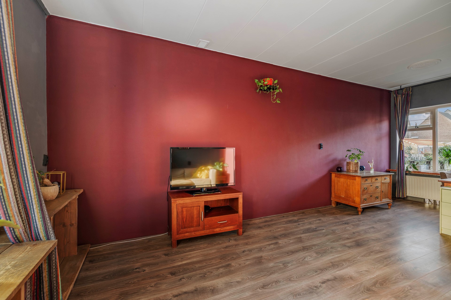Bij de keuken bevindt zich een halletje met aansluitingen voor wasmachine en droger, het toilet met fonteintje en een deur naar de achtertuin. De deur in de keuken geeft toegang tot de woon-/eetkamer. Door ramen aan beide zijden, profiteer je hier van veel lichtinval en een open sfeer.
