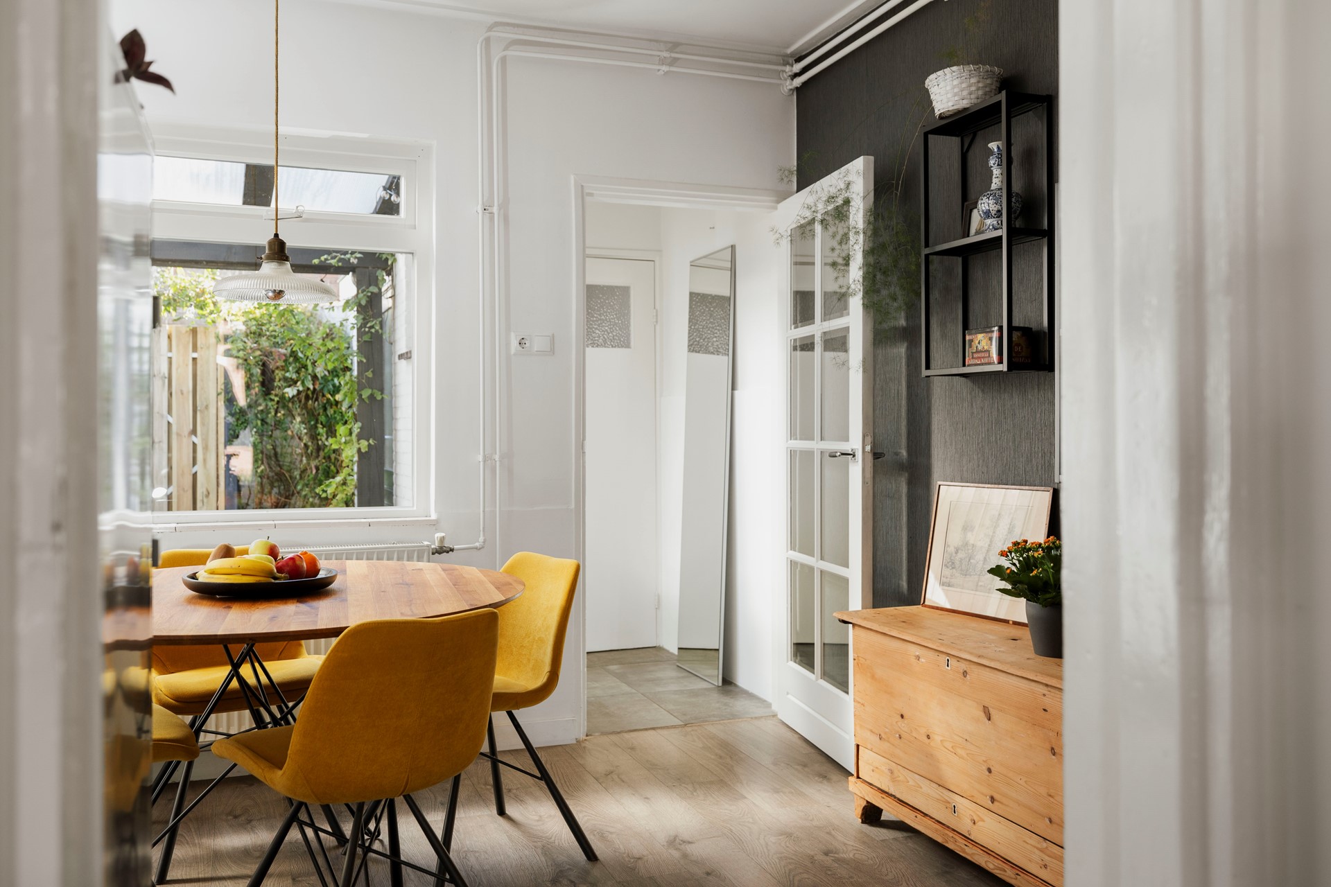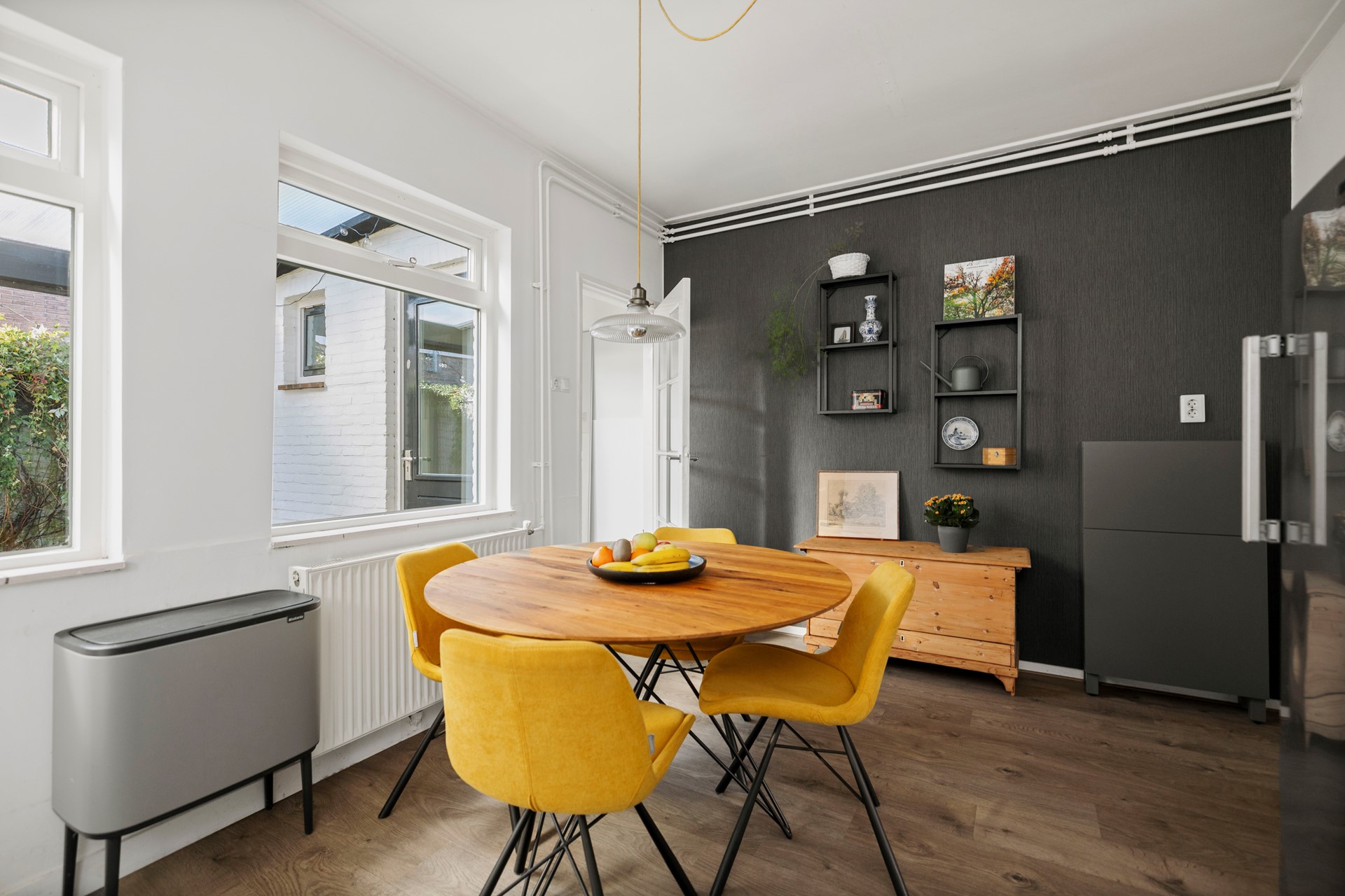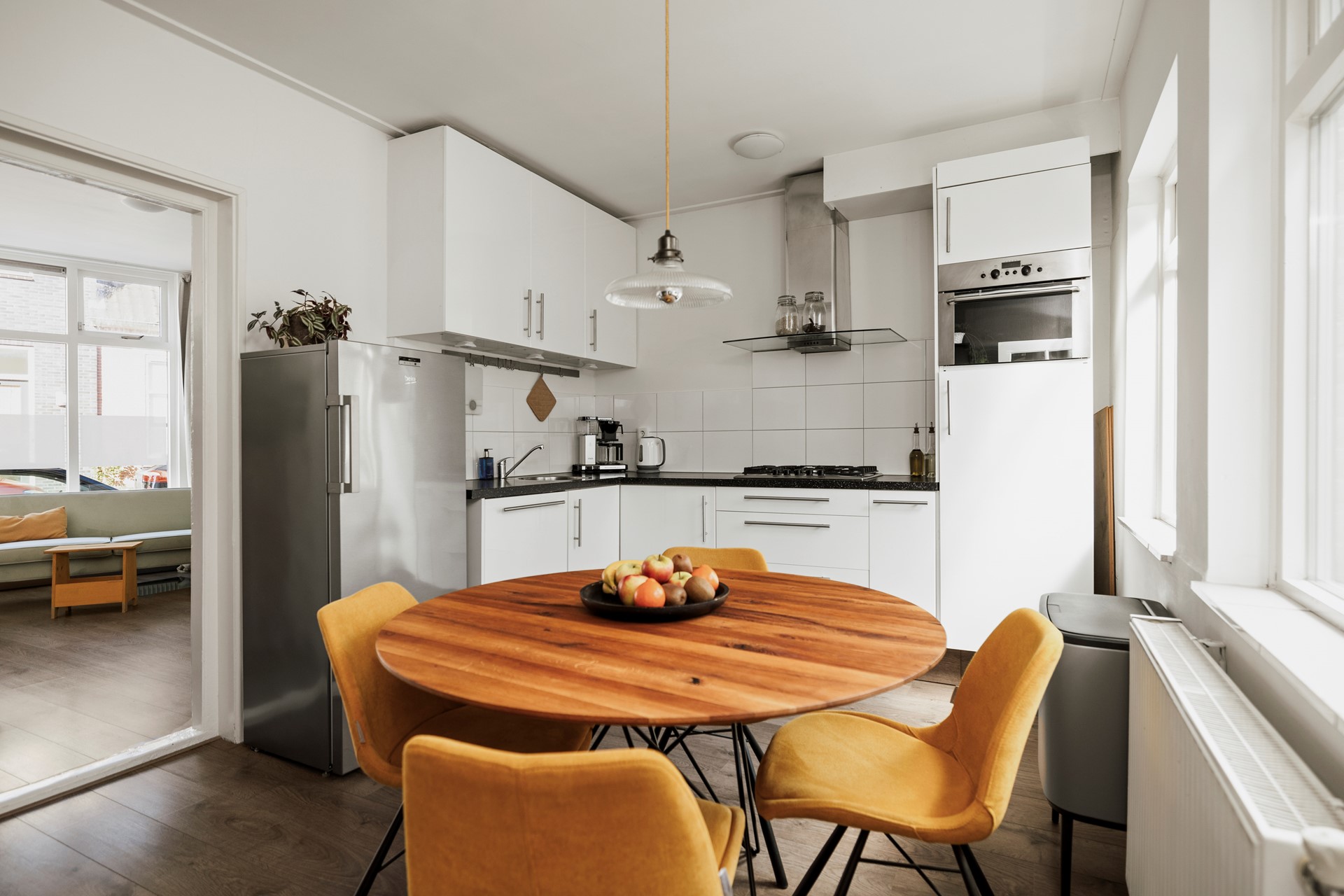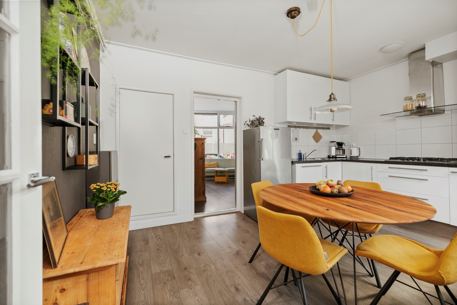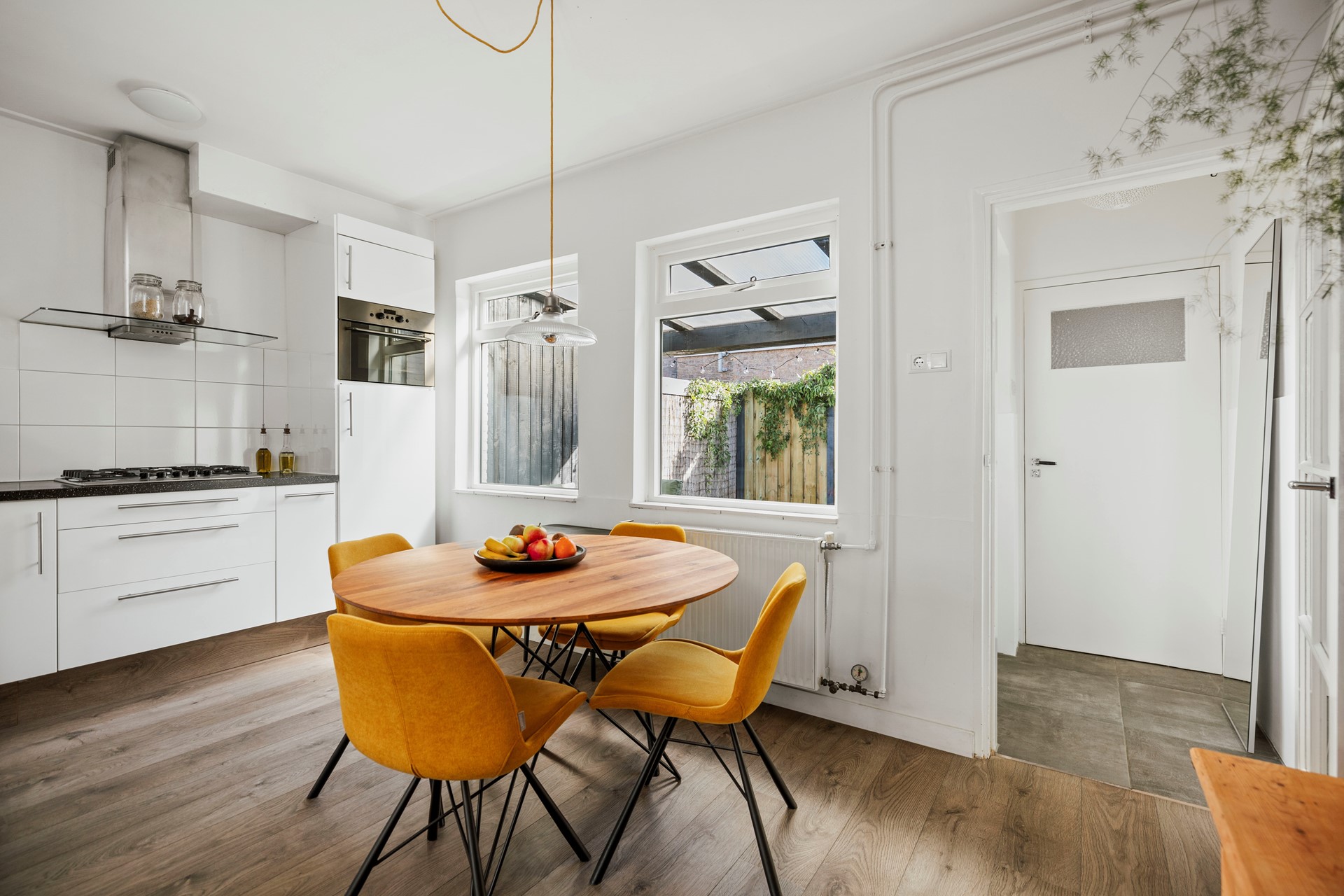 Vanuit de sfeervolle woonkamer loop je richting de gesloten leefkeuken. Terwijl je gasten aan tafel zitten en jij met hen in gesprek blijft, maak je de lekkerste gerechten klaar. Alles is hiervoor aanwezig, want de keuken is voorzien van een vijfpitsgasfornuis met afzuigkap, vaatwasser, spoelbak, koelkast en combimagnetron. Via de keuken loop je een hal in aan de achterkant van de woning. Hier vind je het toilet en de deur naar de heerlijke stadstuin.