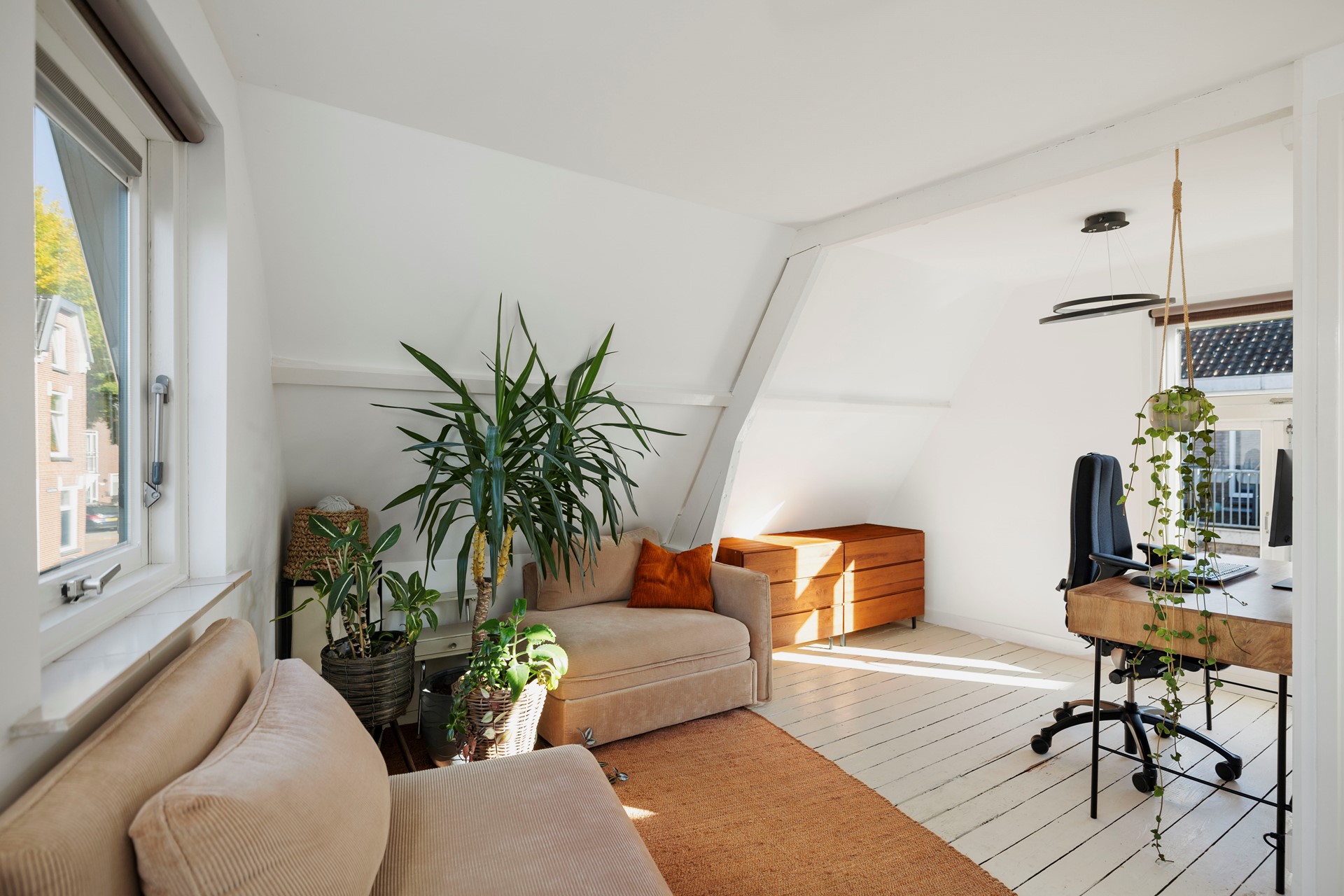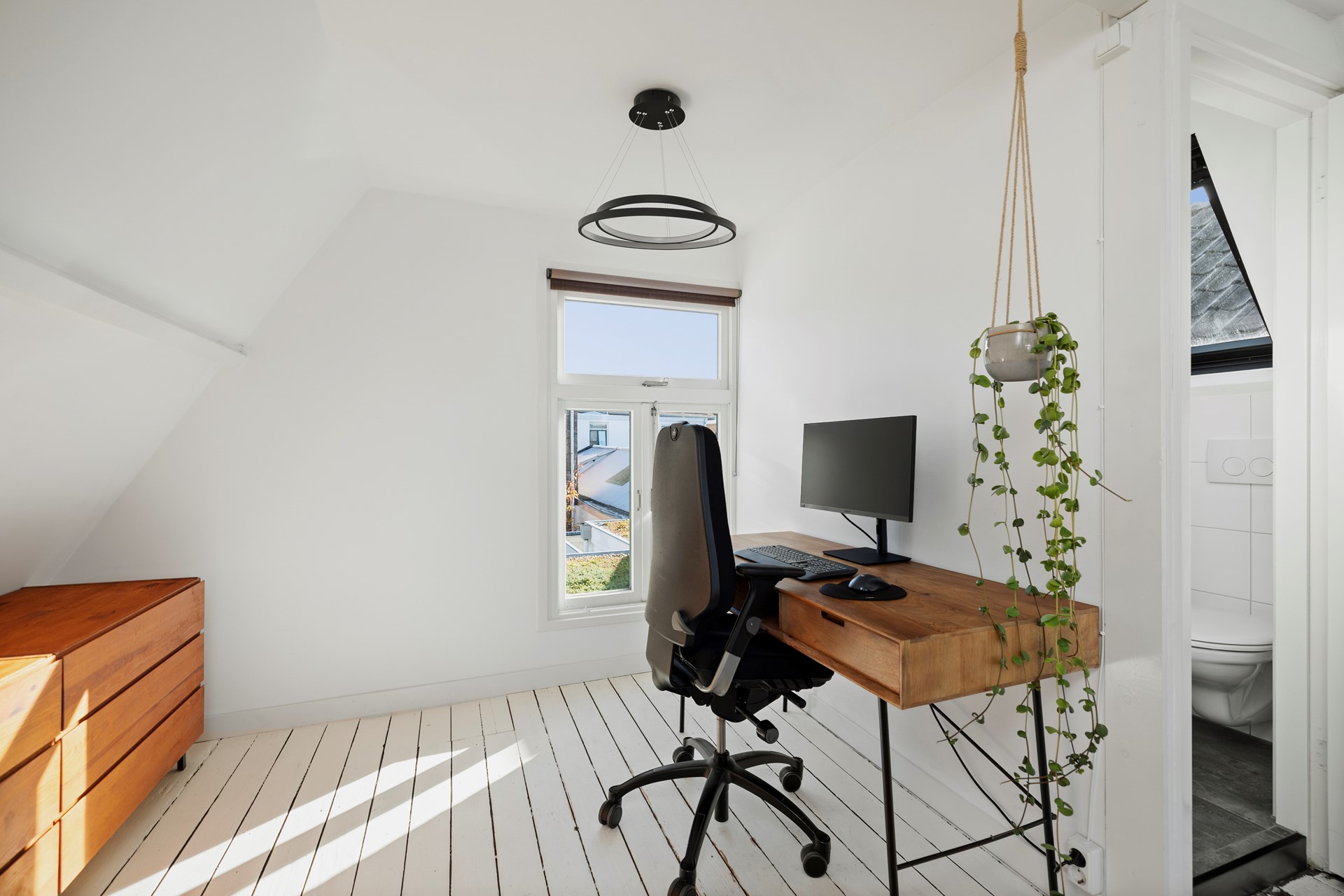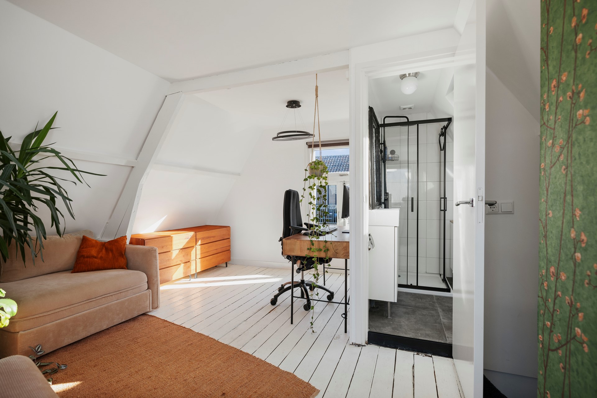 Boven aan de trap bevindt zich de cv-ketel (Nefit, 2015) en kom je in een lichte, open ruimte die volop mogelijkheden biedt. Je kunt hier je slaapkamer inrichten of er eenvoudig twee kamers van maken. Vanuit de ruimte kijk je aan de achterkant uit op het sedumdak. De open ruimte geeft toegang tot de badkamer, met douche, wastafelmeubel en toilet.
