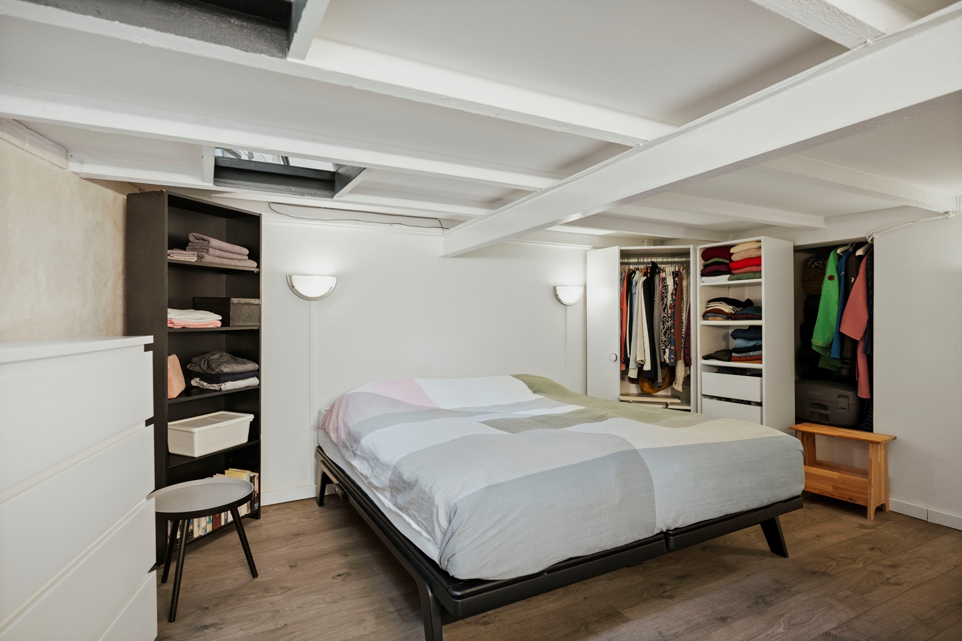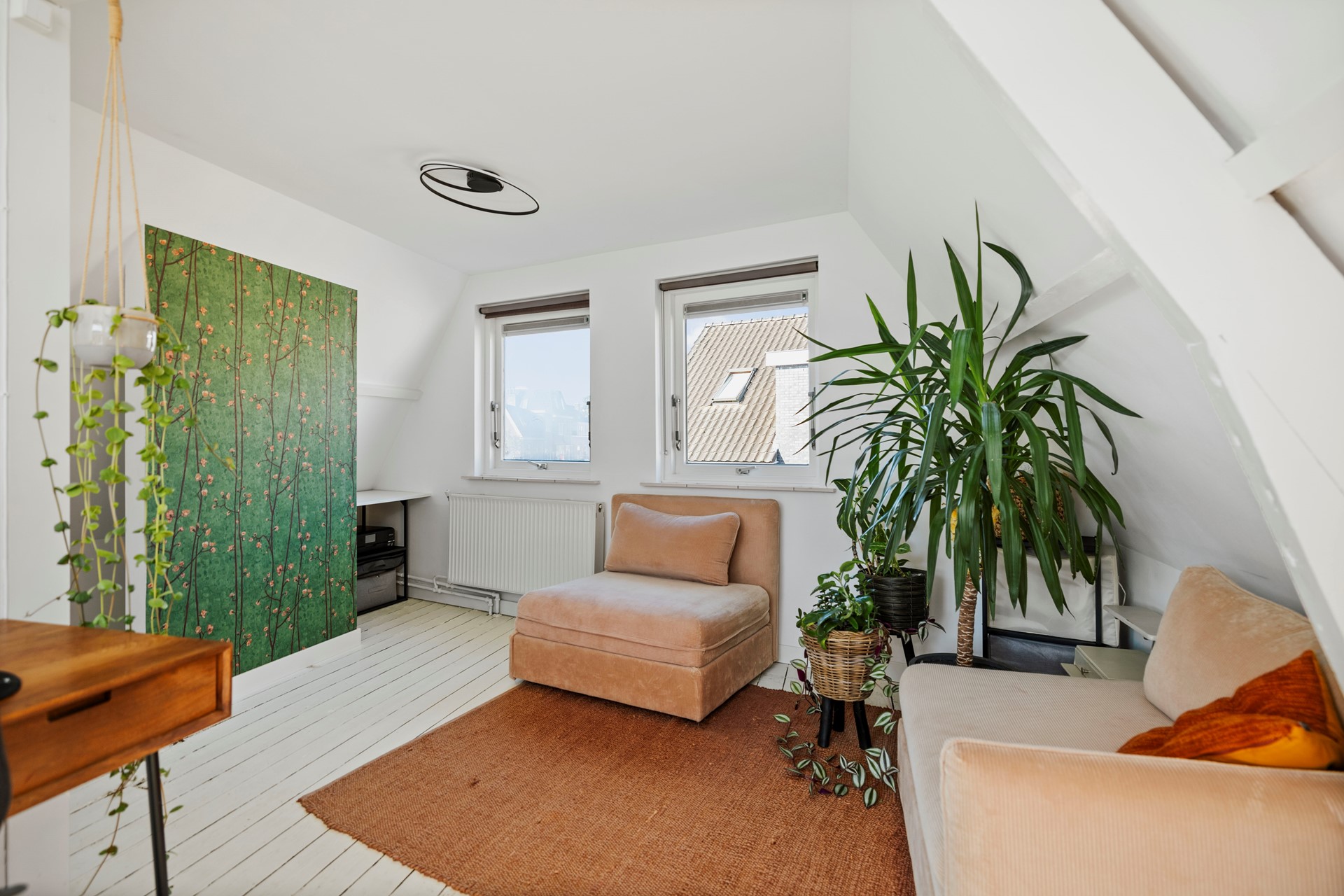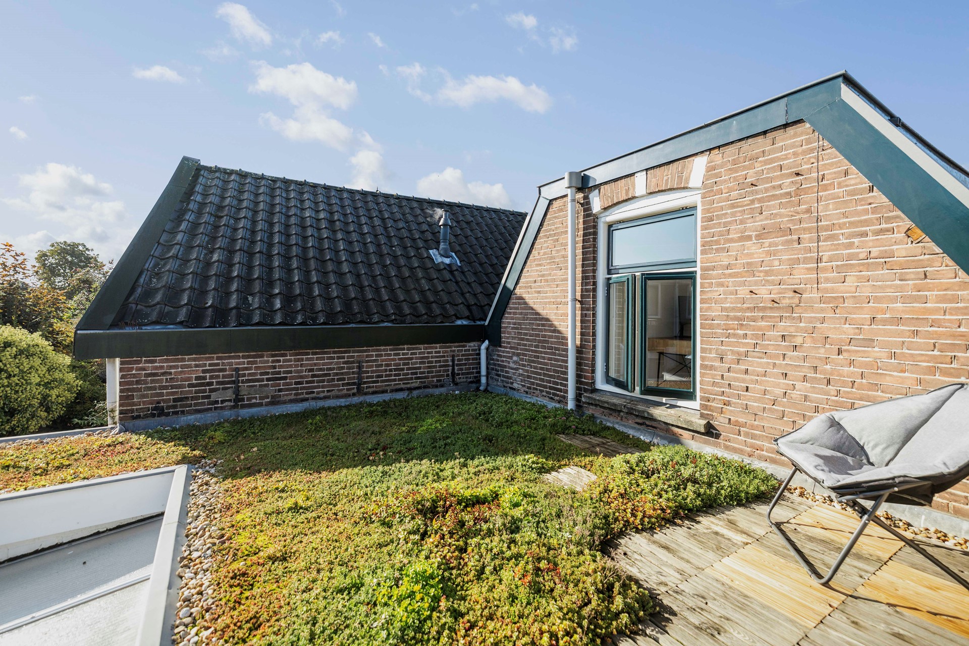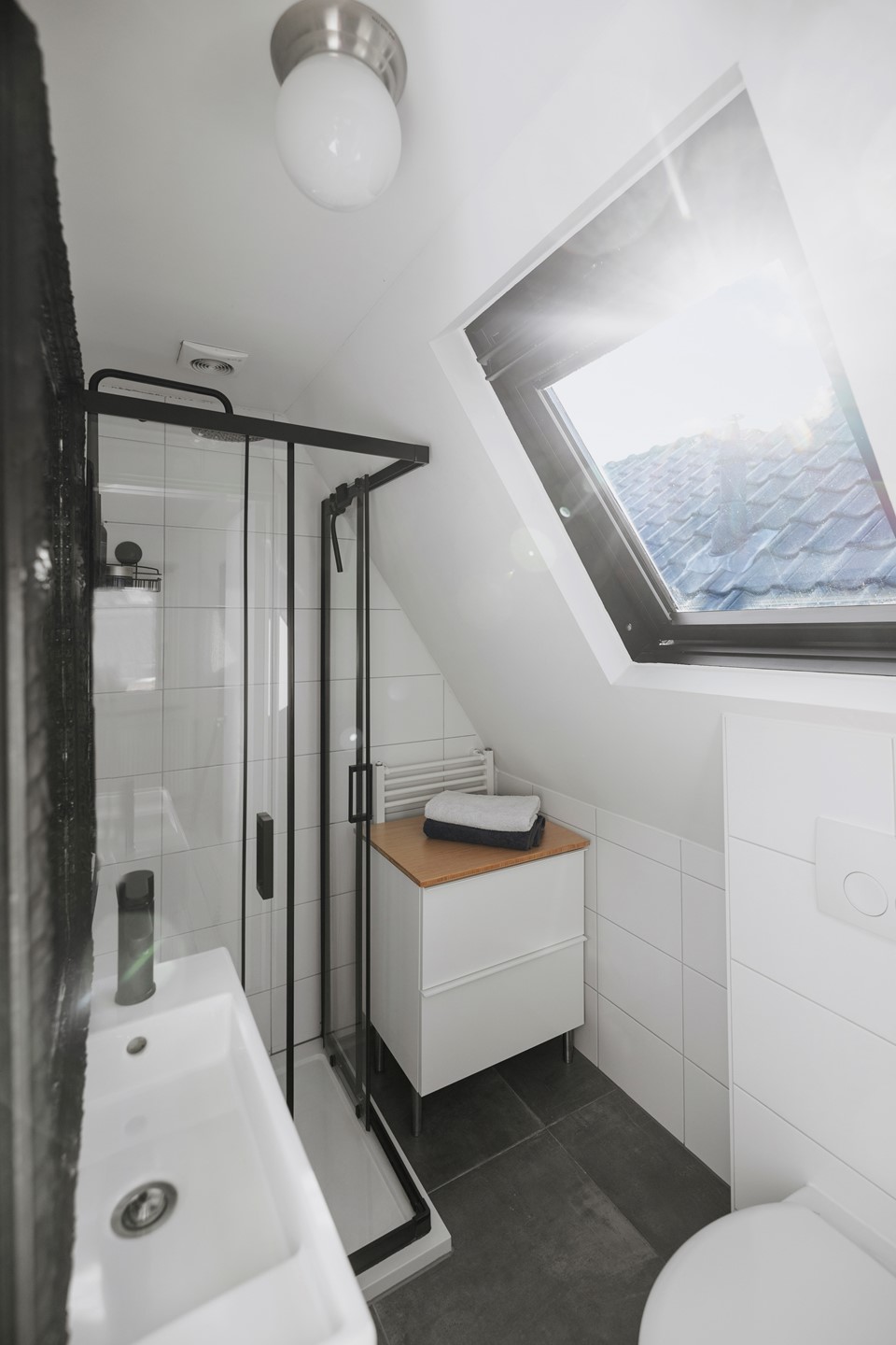 Boven aan de trap bevindt zich de cv-ketel (Nefit, 2015) en kom je in een lichte, open ruimte die volop mogelijkheden biedt. Je kunt hier je slaapkamer inrichten of er eenvoudig twee kamers van maken. Vanuit de ruimte kijk je aan de achterkant uit op het sedumdak. De open ruimte geeft toegang tot de badkamer, met douche, wastafelmeubel en toilet.