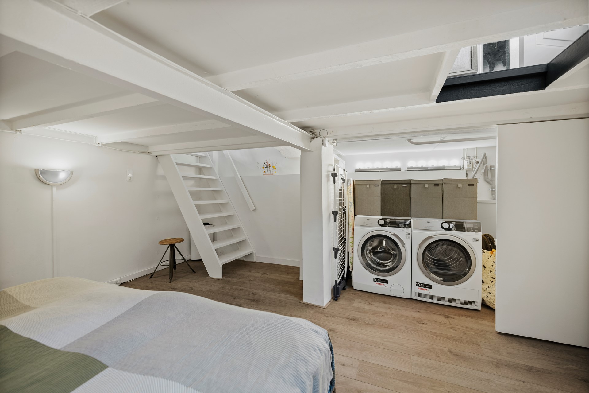 Vanuit de keuken heb je toegang tot de ruime kelder. Deze is nu ingericht als slaapkamer, maar kun je helemaal naar eigen wens vormgeven. Dankzij de ramen in het plafond profiteer je in de ruimte van natuurlijk lichtinval en zou je hier ook goed een werkruimte van kunnen maken. In de kelder vind je de aansluiting voor de wasmachine en de droger.