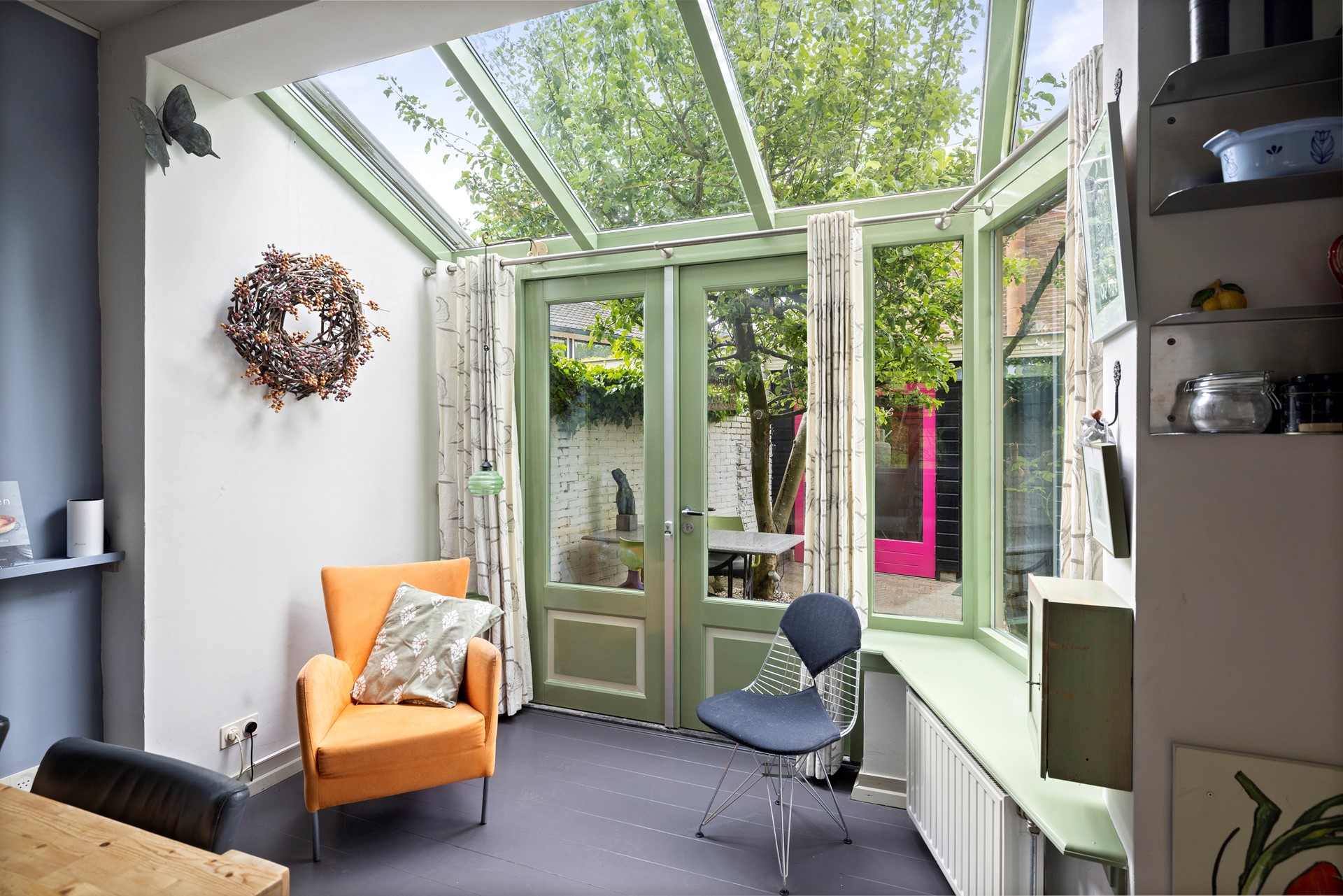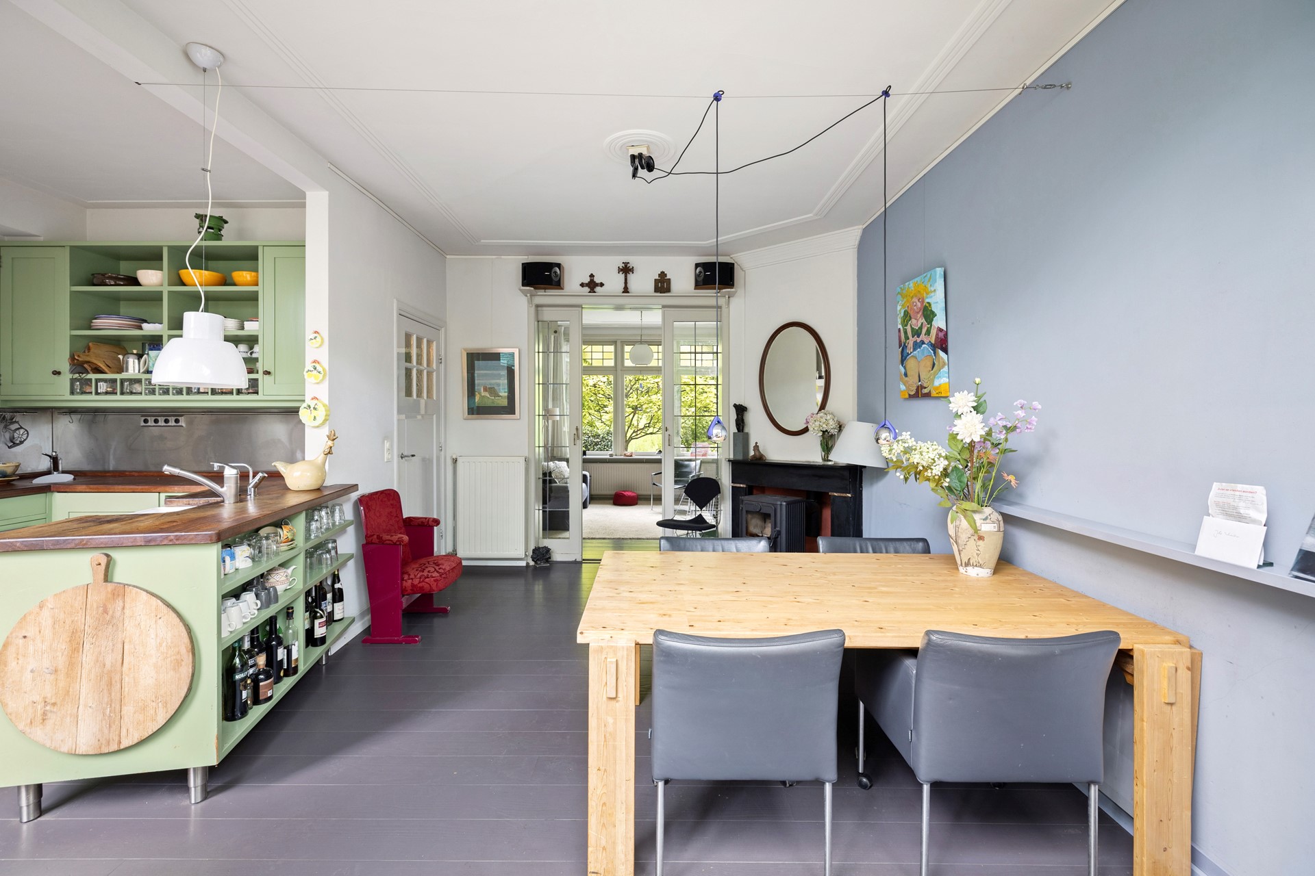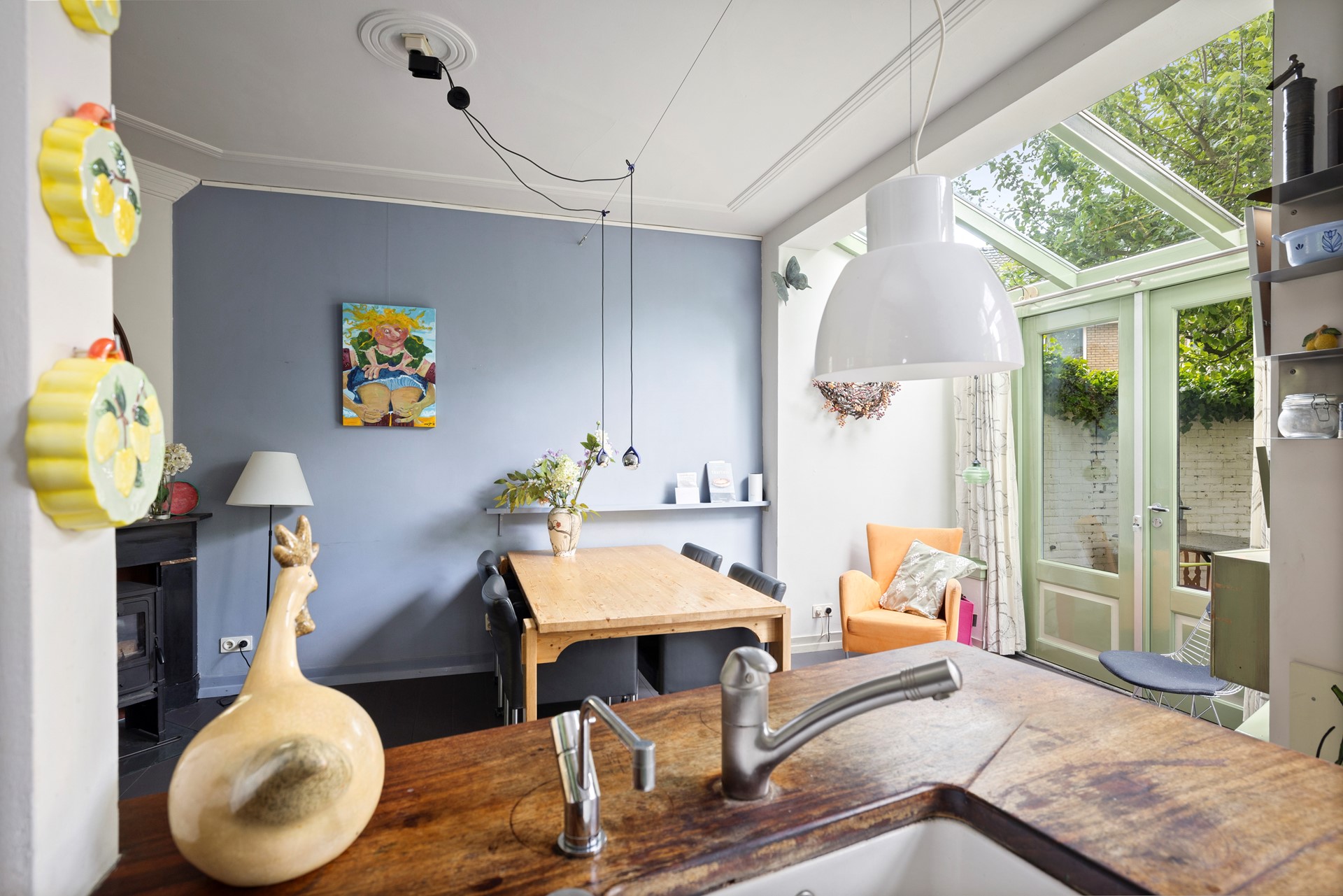 Via een authentieke paneeldeur bereik je de eetkamer, waar direct de originele schouw en houtkachel opvallen, evenals de lichte serre. De serre heeft dubbele deuren naar de achter-tuin, die je ’s zomers heerlijk bij je woning betrekt. De eetkamer grenst aan een open keuken, voorzien van een Boretti-gasfornuis met oven, koelkast en een spoelbak met een Quooker. Onder de mooi gestucte plafonds met sierlijsten diner jij hier in stijl.