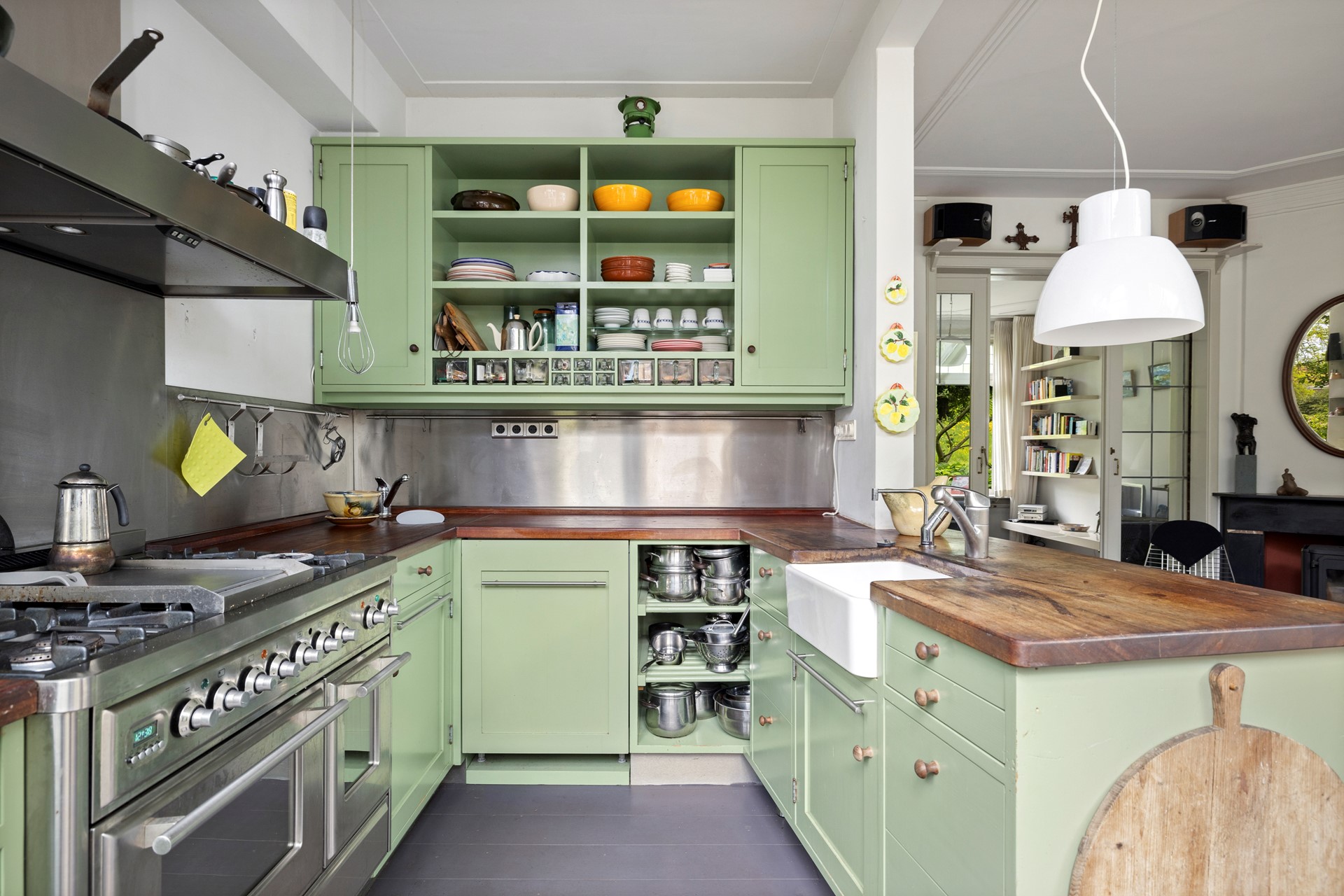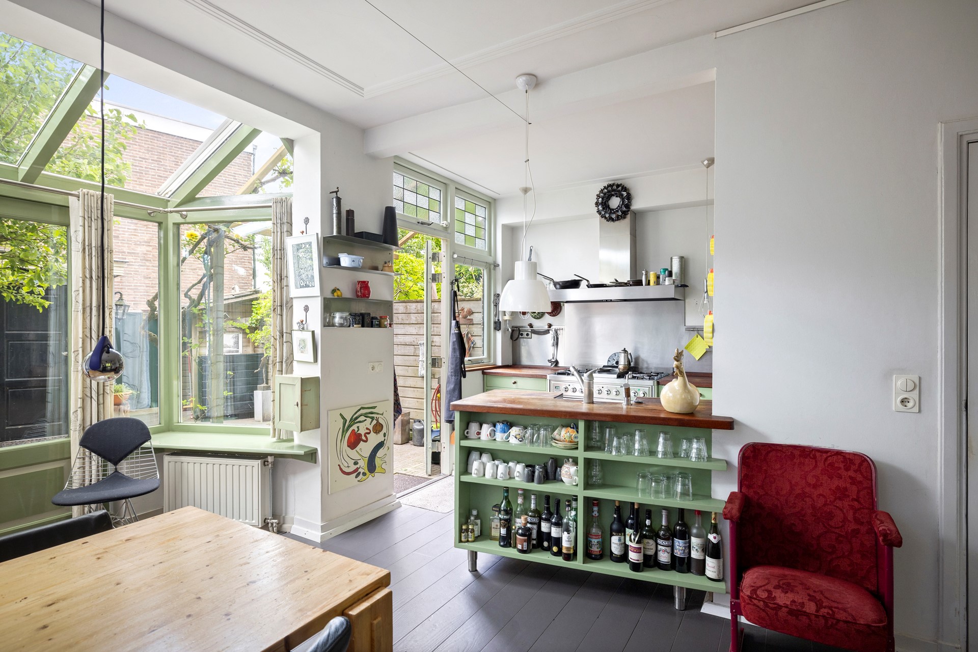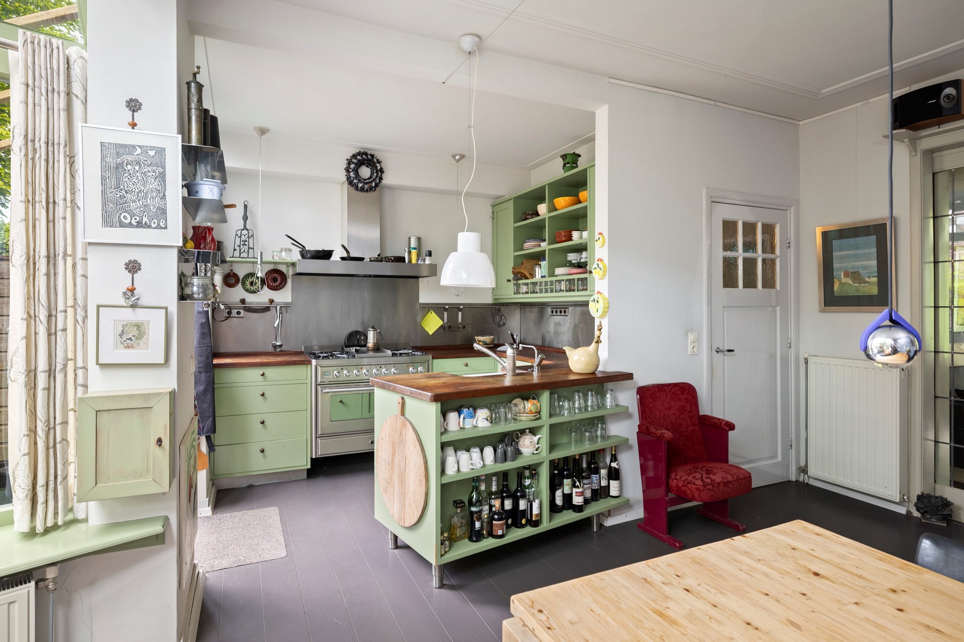 Via een authentieke paneeldeur bereik je de eetkamer, waar direct de originele schouw en houtkachel opvallen, evenals de lichte serre. De serre heeft dubbele deuren naar de achter-tuin, die je ’s zomers heerlijk bij je woning betrekt. De eetkamer grenst aan een open keuken, voorzien van een Boretti-gasfornuis met oven, koelkast en een spoelbak met een Quooker. Onder de mooi gestucte plafonds met sierlijsten diner jij hier in stijl.